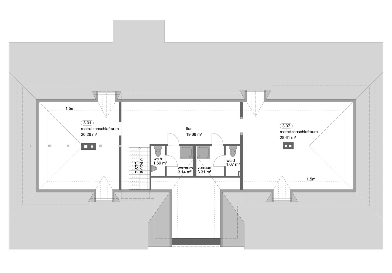 Eine Toilette komplettiert das Raumprogramm auf der Etage und gestattet einen Seminarbetrieb ohne Beeinträchtigung der Unterkunftsetagen.