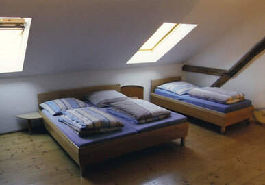 Im Dachgeschoß gibt es gegenwärtig ein Ein-Bett-Zimmer, ein Zwei-Bett-Zimmer und drei Drei-Bett-Zimmer.