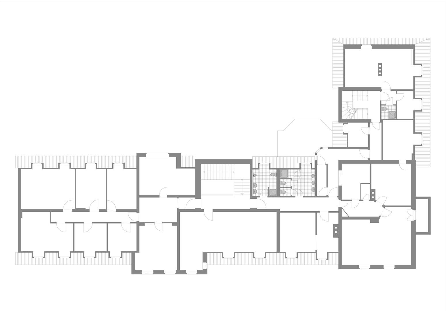 Im Obergeschoß befindet sich der Großteil der sanitären Einrichtungen – jeweils ein Raum mit drei Duschen und mehreren Waschbecken für jedes Geschlecht sowie jeweils ein Toilettenraum mit zwei bzw. drei Toiletten für jedes Geschlecht.