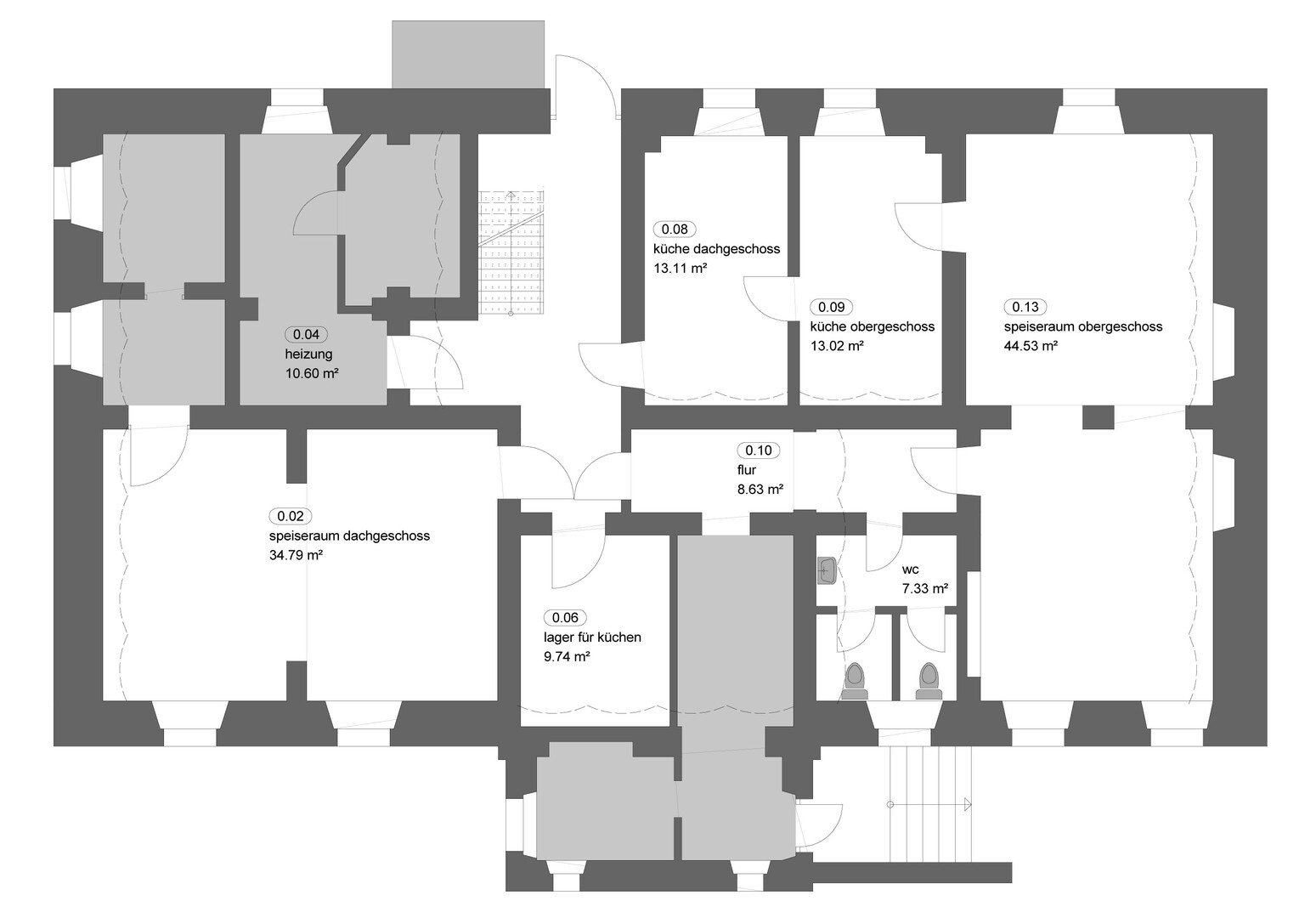 Toiletten für beide Geschlechter sowie Lagermöglichkeiten für Lebensmittel komplettieren das Raumprogramm des Untergeschosses.